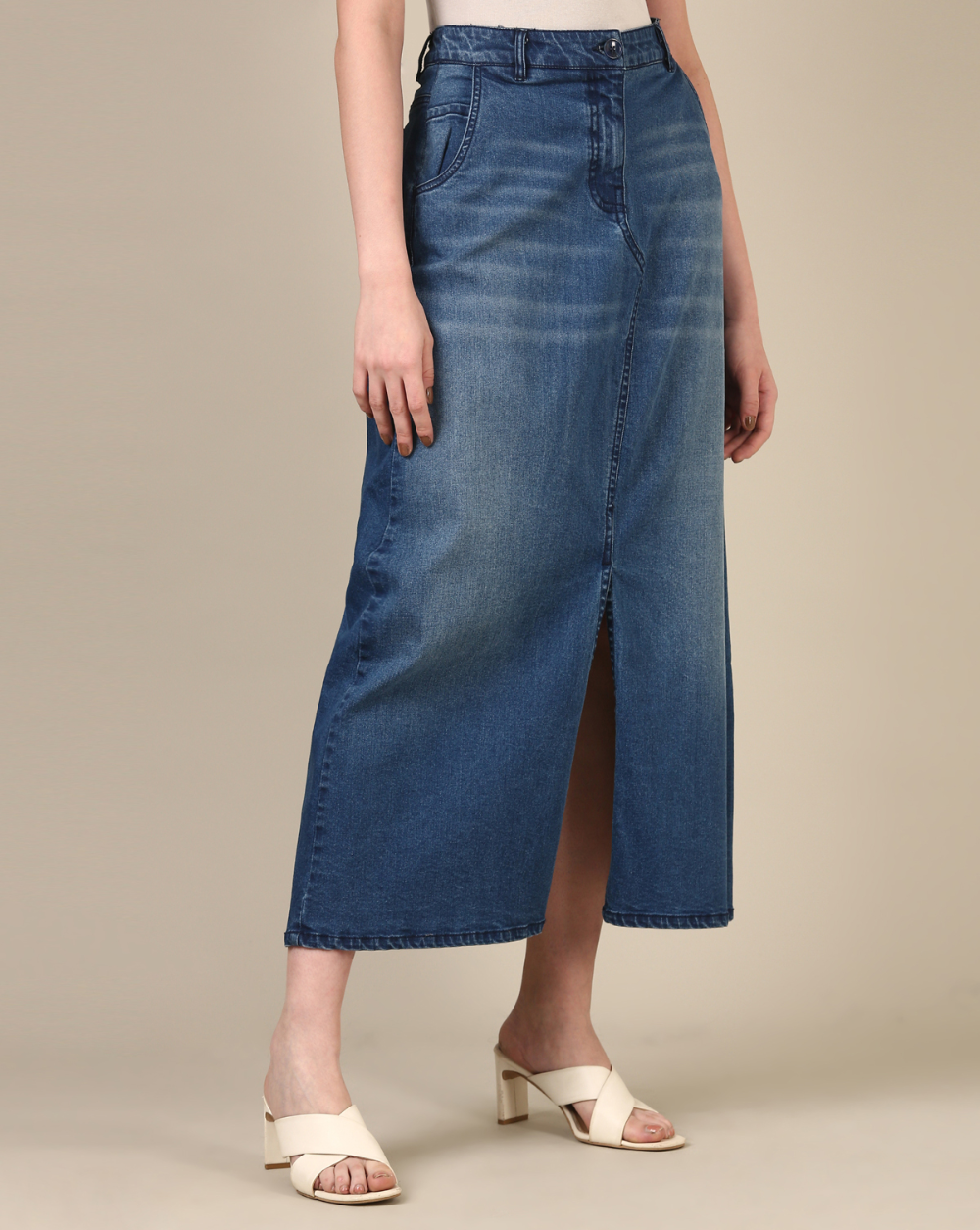 Ladies 5 Pocket Stretch Denim Skirt With Slit Garment Washed